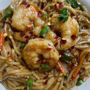 Stir Fry ShrimNoodles with veggie medley infused in an asian sauce
