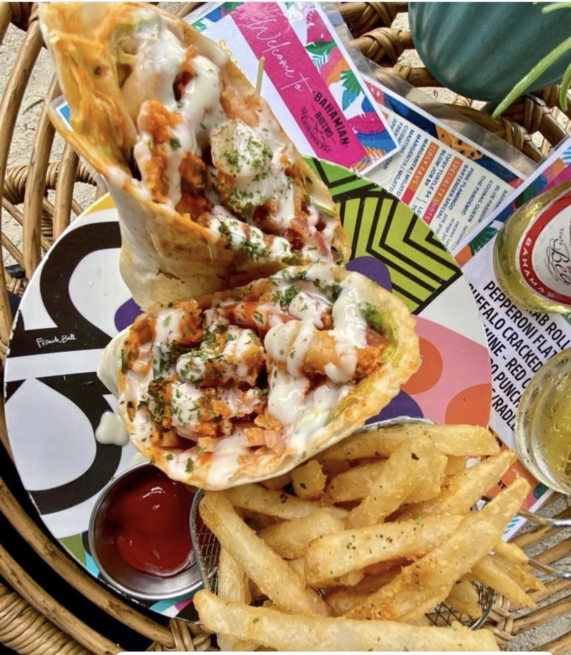 Crack chicken strips dipped in spicy hot sauce and wrapped in a tortilla with lettuce tomatoes, onions, calypso sauce and topped with ranch dressing. Served with fries