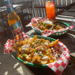 French fries topped with melted cheese, crack chicken chunks, bacon, ranch And scallions