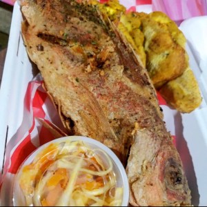 Fried Snapper served with pickliz and plantains