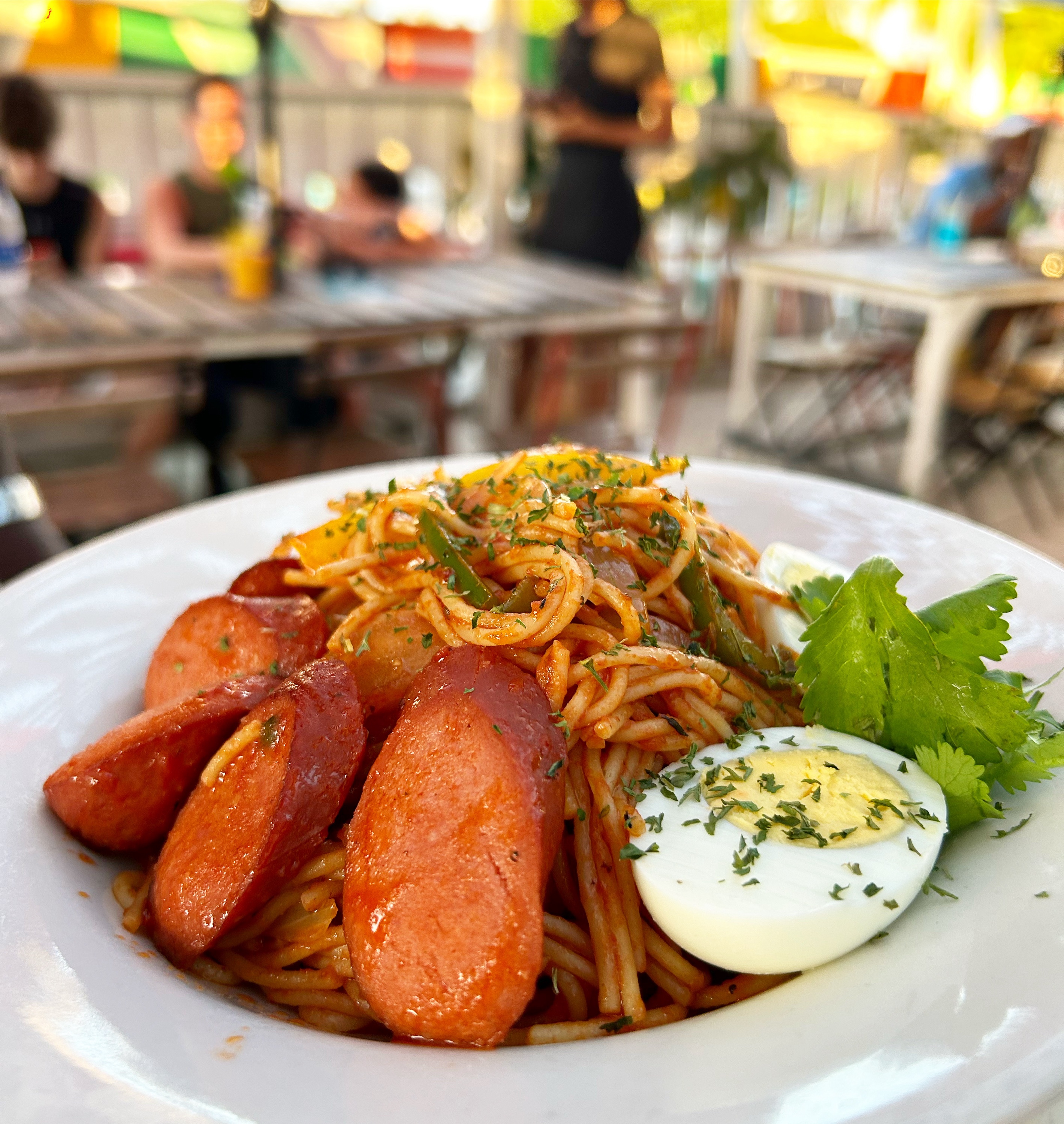 Spaghetti tossed in tomato sauce with hot dog chunks, peppers and onions and serve with boiled egg.