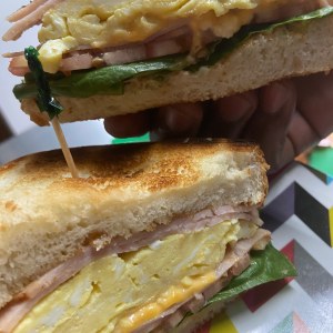 Toasted Homemade bread with eggs, cheese, lettuce, tomatoes, mayo and your choice of meat.