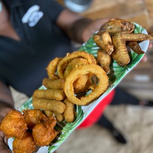 Enjoy tasty bites (5) of everything – Mozzarella Sticks, Onion Rings, Wings and Conch Fritters.
