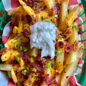 Loaded fries with melted cheese, bacon bits, scallions and a scoop of sour cream