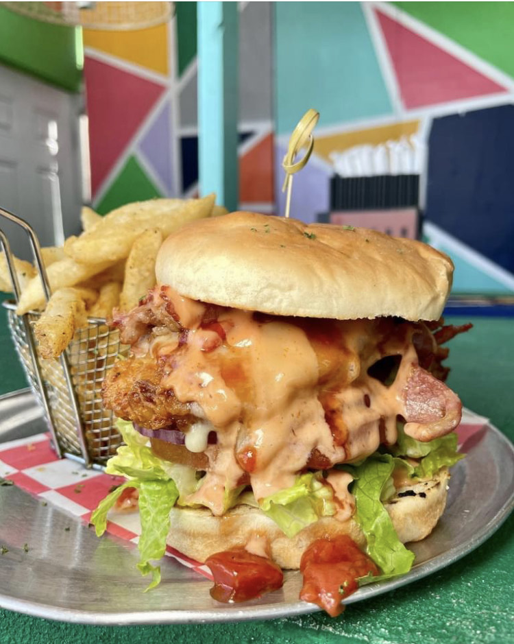 Homemade bun with golden crack chicken topped with pepper jack cheese, crispy bacon, guava bbq suace, lettuce, tomatoes, onions and calypso sauce. Served with your choice of fries