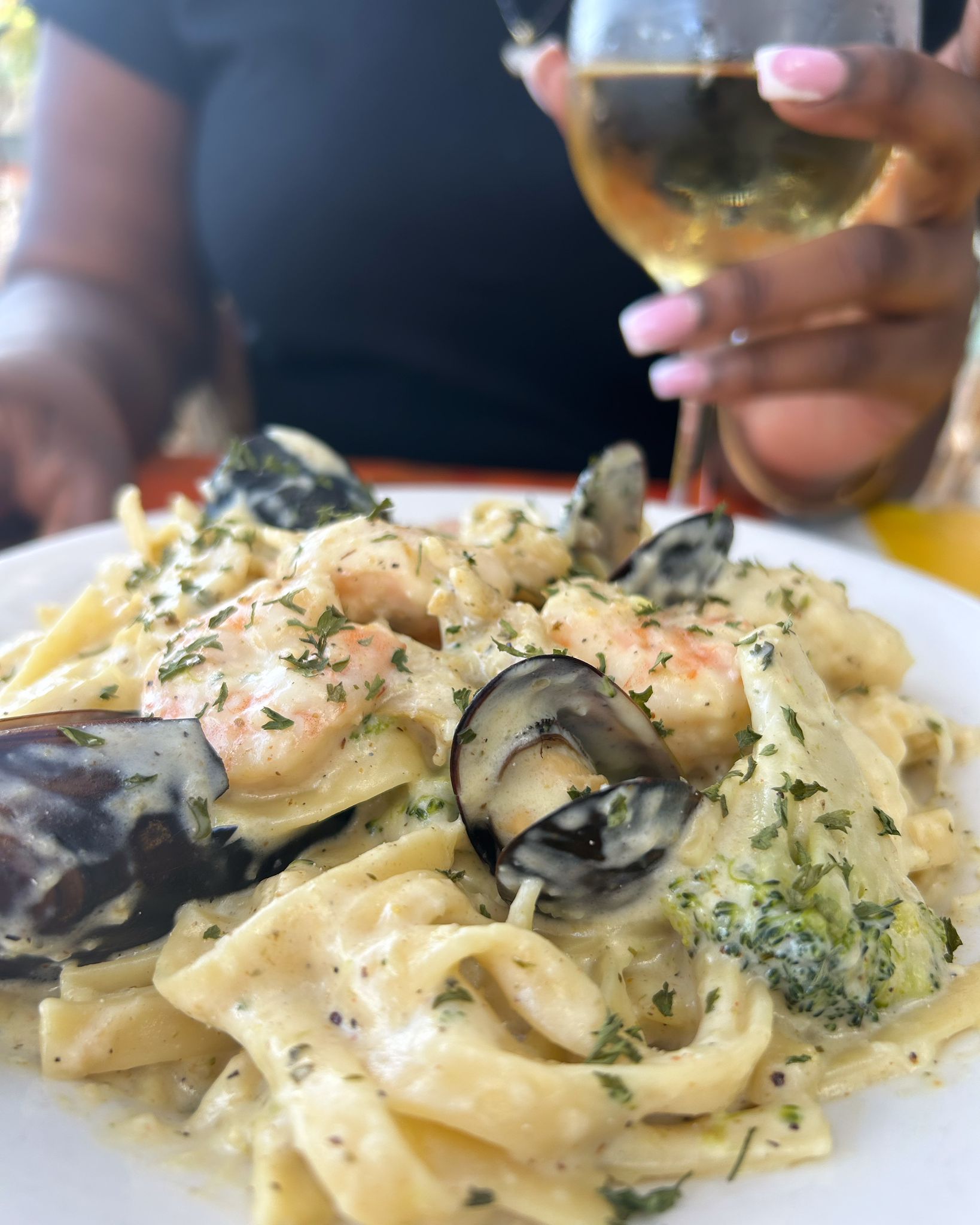 Seafood Pasta in a creamy Alfredo sauce including conch, shrimp plus you can add mussels topped with parmesan, parsley and pepper flakes.