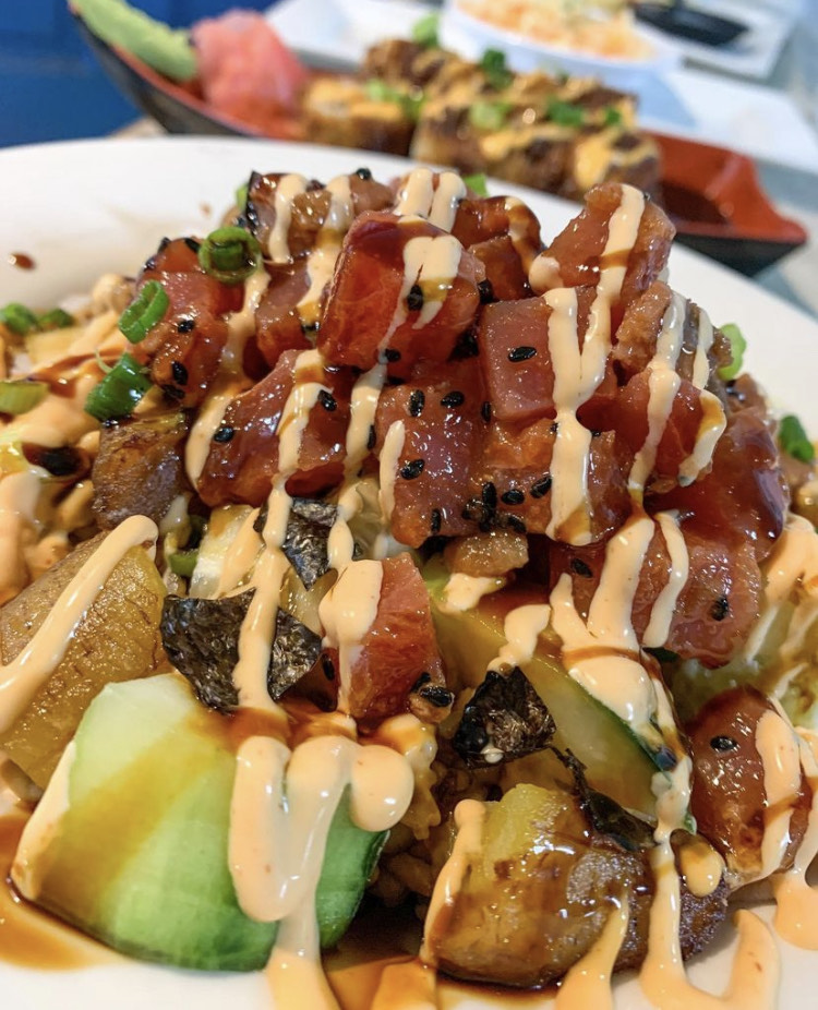 Sushi Rice, topped with avocado, plantain, cucumber, nori, sesame seeds, spicy mayo, eel sauce and select your meat.