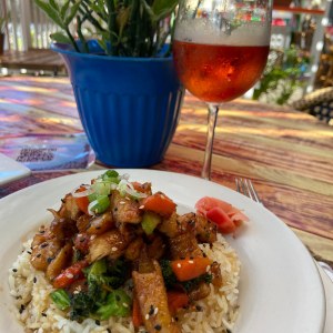 Teriyaki your choice of meat with broccoli and carrots served on top of jasmine rice topped with ginger, scallions and sesame seeds.