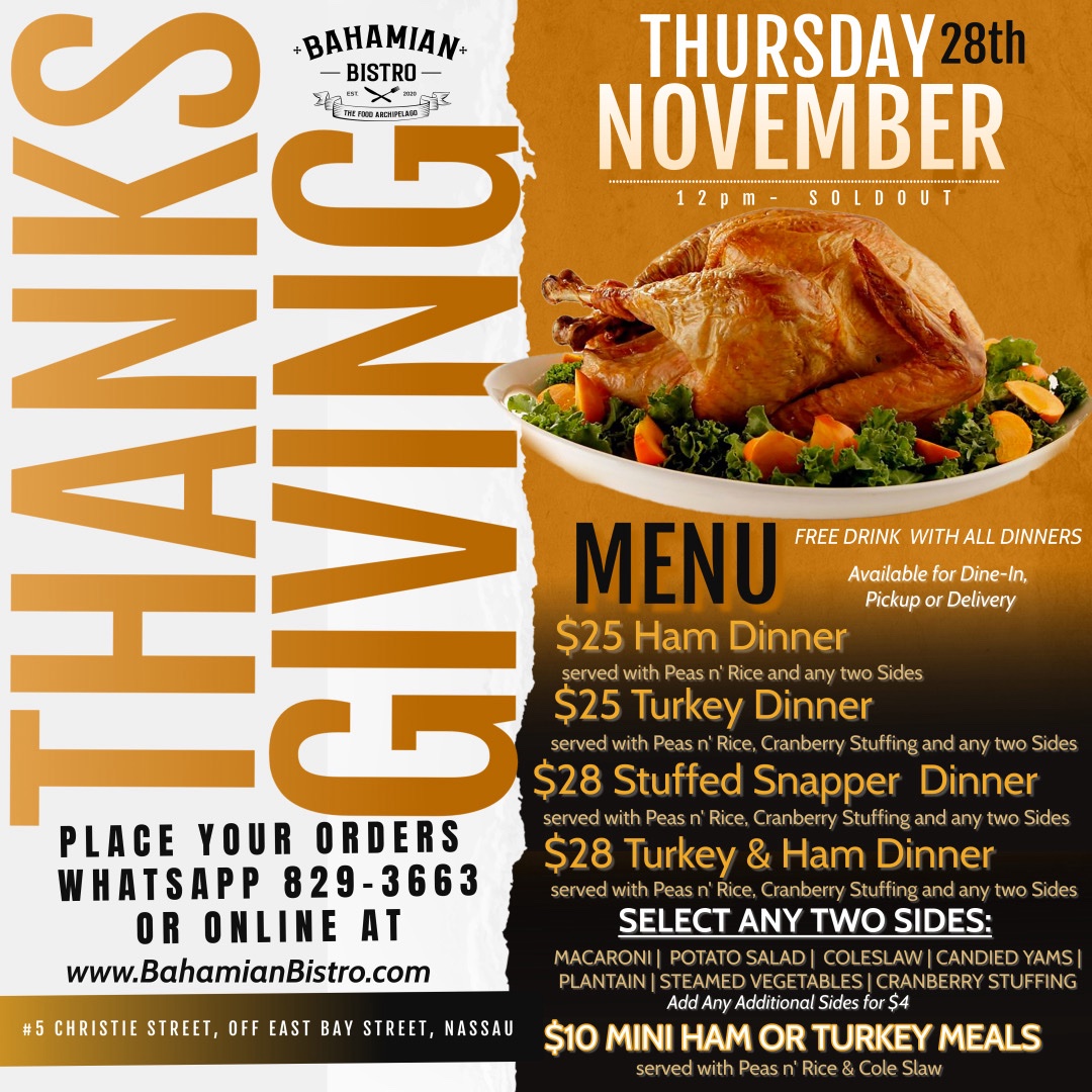 With peas and rice, stuffing and 2 sides (Macaroni, Cole Slaw, Potato Salad, Candied Yams) Please write your options in the notes or sides will be automatically selected.
