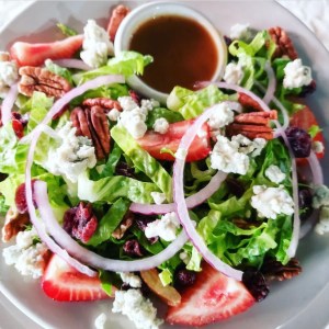 Romaine Lettuce, Strawberry, Blueberry, Craisins, Blue Cheese Crumbles, Nuts and Purple Onions with vinaigrette dressing . Add Grilled Chicken or Shimp.